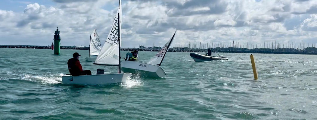 Heute ist nun schon Mittwoch, der vierte Tag in unserem Segelcamp. Unser Tag startete heute wieder pünktlich um 7:30 Uhr mit einer kleinen Runde Frühsport, etwas Ausdauer und Dehnung, und dann ging es auch schon wieder zum Frühstück. Pünktlich um 9:30 Uhr segelten wir fertig an den Boten und konnten gemeinsam rausfahren. In der ersten Einheit war der Wind doch recht frisch und die Wellen ordentlich hoch, und so konnten die Kinder noch mal ihr Gefühl für Wellen, Windböen und Salzwasser stärken. Die erste Übung lag darin, einen guten Abendkurs zu fahren und Wenden zu üben in den Wellen. Wie wendet man in einer Welle richtig, was ist anders im Gegenzug zum Flachwasserrevier? Pünktlich 12:30 Uhr pgab es wieder Mittag. Danach hatten die Kinder eine Pause, wir trafen uns zur zweiten Einheit wieder auf dem Steg. Der Wind hat wieder seine Richtung komplett geändert. Es wehte noch frischer Wind, aber die Wellen waren nicht mehr ganz so stark. In der zweiten Einheit konnten wir das starten und üben, Ziel war eine Cardinal-Tonne. Zum Abschluss ging es vor Wind zurück Richtung Leuchtturm. Danach gab es wieder Abendbrot, und die Kinder hatten noch etwas Freizeit und ließen sich alle in ihren Betten. Sowohl Trainer als auch Kinder waren von der frischen Luft müde und wir freuen uns auf den morgigen Tag.