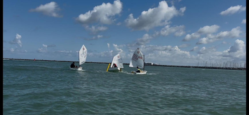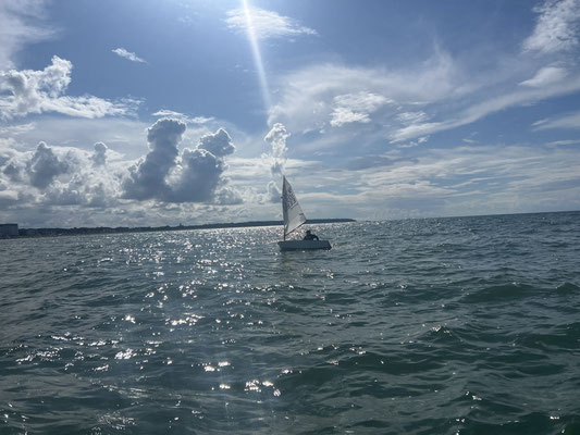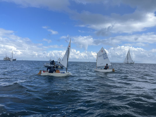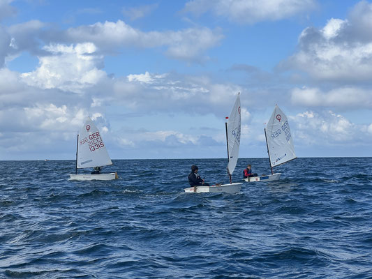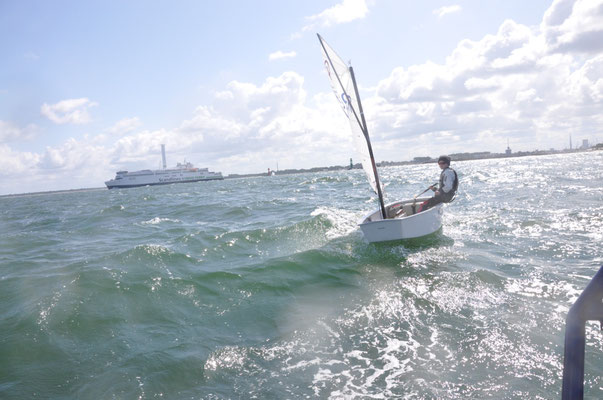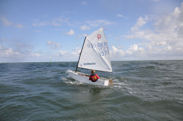 Augen gingen auf und wir hatten wieder: Sonne und Wind. Zudem hatten wir wirklich tolle Wellen, schön größ und lang. Perfekt für den Opti. Auf der Kreuz kann der Opti schön "klettern" und Vorwind