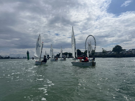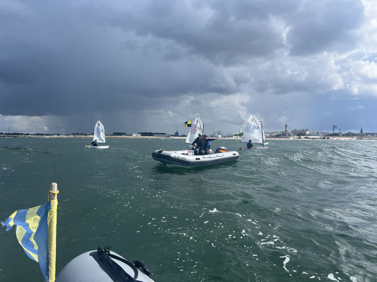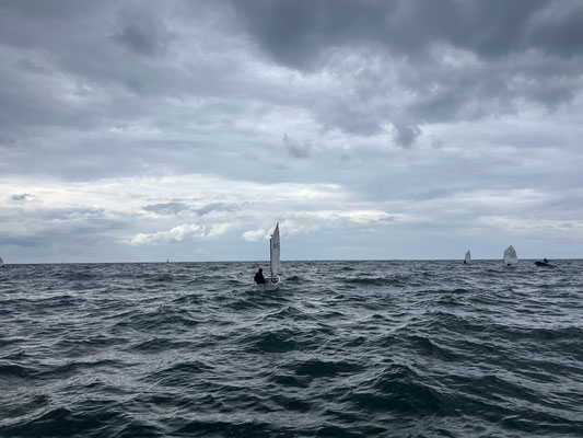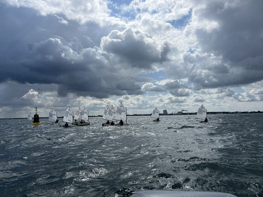 Der Wind war voll auf unserer Seite und die Gewitter/Regen zogen an uns vorbei. Wir legten wieder einen kleinen Kurs. Kids schön auf die Startlinie und ab hoch zur Luvtonne … und auf Vorwind zurück - bei Wind uns Welle …