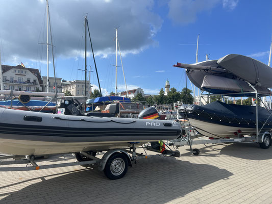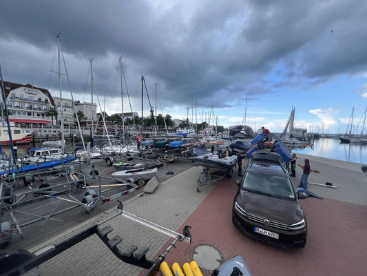 Sonntag, der 21.07.24 war es wieder soweit: wir fuhren gemeinsam nach Warnemünde. Treffpunkt war 8:30 Uhr im YCBG. Bence plus 8 Kinder durften mit dem YCBG- Vereinsbus+Anhänger fahren. Doreen zog mit Jette, Kathrin, Nicki und Till in unserem schwarzen Vereinsbus plus Anhänger los. Die Eltern von Max H. waren so lieb und haben den SVR-Trailer nach oben gezogen ... die restlichen Boote wurden von Martin Schlaaf und Eltern des YCBG sicher an die Küste gebracht. Danke schonmal dafür. Pünktlich gegen 12 Uhr kamen alle in Warnemünde an. Viele helfende Hände haben das Abladen und Aufbauen der Boote erleichert. Es war ganz schön warm am Sonntag, knapp 30 Grad Celsius. Danach wurden die Zimmer bezogen, etwas ausgepackt und es ging für alle in Badebekleidung an der Strand. Bei solchen Temperaturen muss man einfach in die Ostsee springen. Zum Abschluss des Tages ging es zum gemeinsamen Pizza essen. Ein gelungener Tag ging zu Ende.