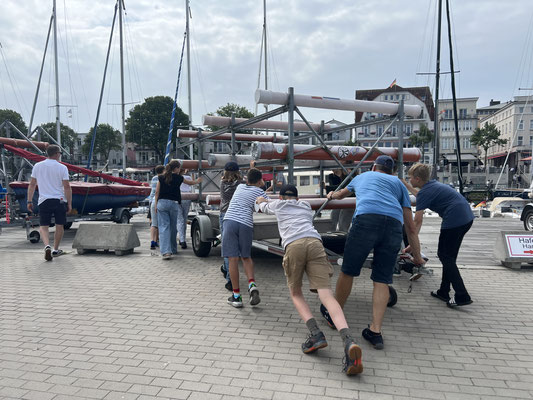 Es war soweit, unser letzter Morgen in Warnemünde. Wir haben noch die restlichen Sachen eingepackt (Trockenraum und Zimmer leer gemacht). Einige Kinder wurden von ihren Eltern und Geschwister schon abgeholt. Wir haben noch ein paar nette Worte verteilt und haben uns sehr lieb von allen verabschiedet. Zurück in Berlin wurden bereits alle Boote wieder abgeladen und die Riggs aufgebaut.