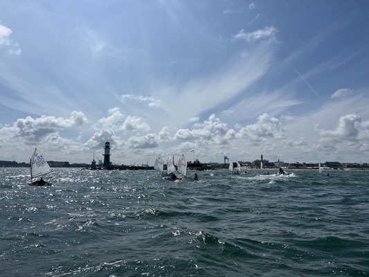 Der heutige Tag startete wieder mal mit unserer Frühsportrunde, danach ging es zum Frühstück und dann machten sich alle Kinder fertig zum Segeln. Pünktlich gegen 10:00 Uhr verließen wir den Hafen und fuhren auf die Ostsee. Heute gab es leider nur sehr wenig Wind, zwischen zwei und drei Windstärken. Dieser Wind bot uns aber auf jeden Fall mal die Gelegenheit, auch in der B-Gruppe des Starten zu üben und wir konnten noch mal genauer auf dem Amwind-Kurs Fehler korrigieren. In der Mittagspause hatten die Kinder wieder etwas Zeit für sich. Die Prognose für den Nachmittag war sehr regnerisch und mit wenig Wind. So entschieden wir uns, einen Ausflug an den Strand zu machen, und wie das Wetter manchmal hier so ist, an der See kann sich das auch mal schnell ändern. Wir hatten herrlichen Sonnenschein am Strand und es konnte Fußball und Volleyball gespielt werden. Die Kinder konnten ihre Füße in die Ostsee stecken. Zurück ging es dann am Leuchtturm von Warnemünde vorbei in die Unterkunft. Nach dem Essen trafen wir uns alle gemeinsam in der siebenten Etage des Wirotels und haben gemeinsam eine Runde Stadtlandfluss gespielt.
